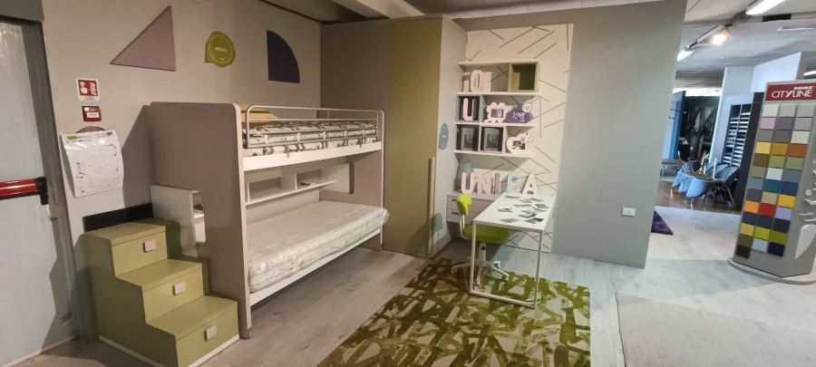 Letto a castello scorrevole Roy di Doimo Cityline è una comoda soluzione salva spazio per le camerette dove si vuole lasciare più spazio possibile per il gioco e il movimento dei bambini. Un castello scorrevole funzionale, comodo ed elegante, ideale per arredare la cameretta doppia sia per bambini che per ragazzi. La struttura del letto a soppalco scorrevole è composta da diversi elementi: la scala a 3 cassettoni ideali per contenere oggetti ingombranti e giochi, comoda pedana perfetta per raggiungere il letto superiore in tutta facilità e sicurezza, libreria integrata nella pedana, meccanismo di scorrimento frenabile che garantisce il bloccaggio della struttura scorrevole, comode reti a doghe su entrambi i letti e protezione di sicurezza del letto superiore. Il meccanismo scorrevole permette di tenere chiuso il letto ed aprirlo solo all’ occorrenza con un semplice movimento.