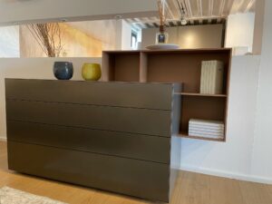 Il sistema Ecletto è caratterizzato dalla testata con pannelli imbottiti e non, la stessa è possibile comporla anche con comodini e moduli a giorno, così da personalizzare la propria boiserie letto. In abbinamento abbiamo inserito il comò Domino, caratterizzato dal modulo a giorno a sbalzo per dare movimento. Il tutto in laccato opaco Bianco Artico con dettagli in laccato Terracotta e Piombo.