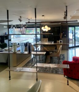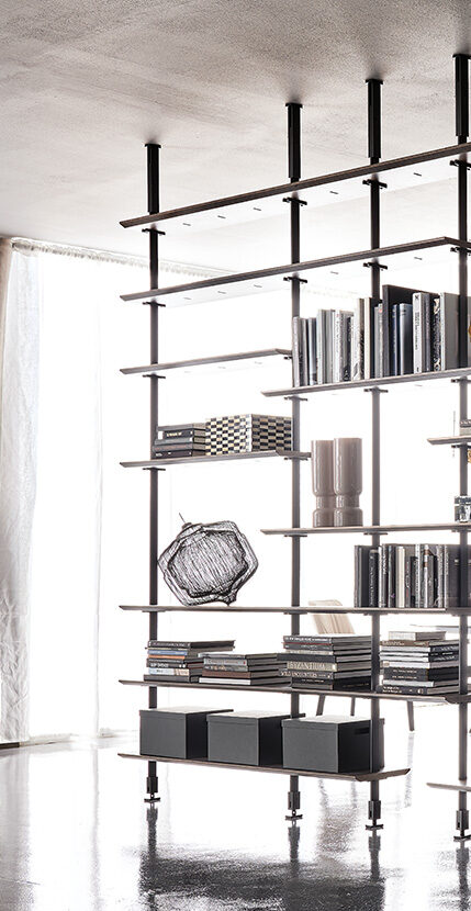 Libreria Airport con montanti grigio Graphite e mensole in legno Noce Canaletto, è possibile personalizzare la composizione in base alle esigenze del cliente, con anche elementi contenitivi e/o zona studio.