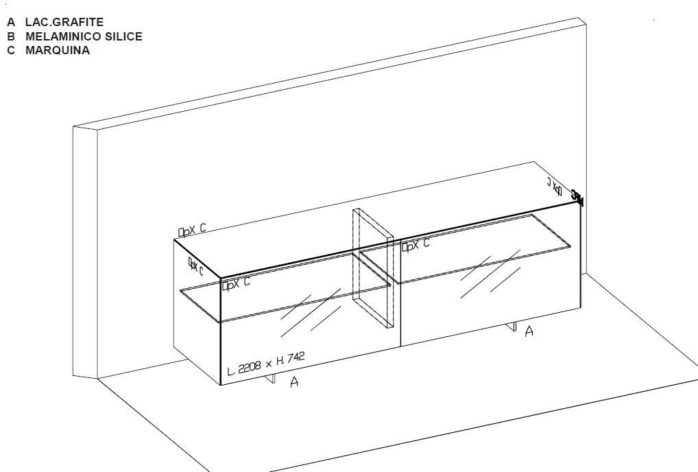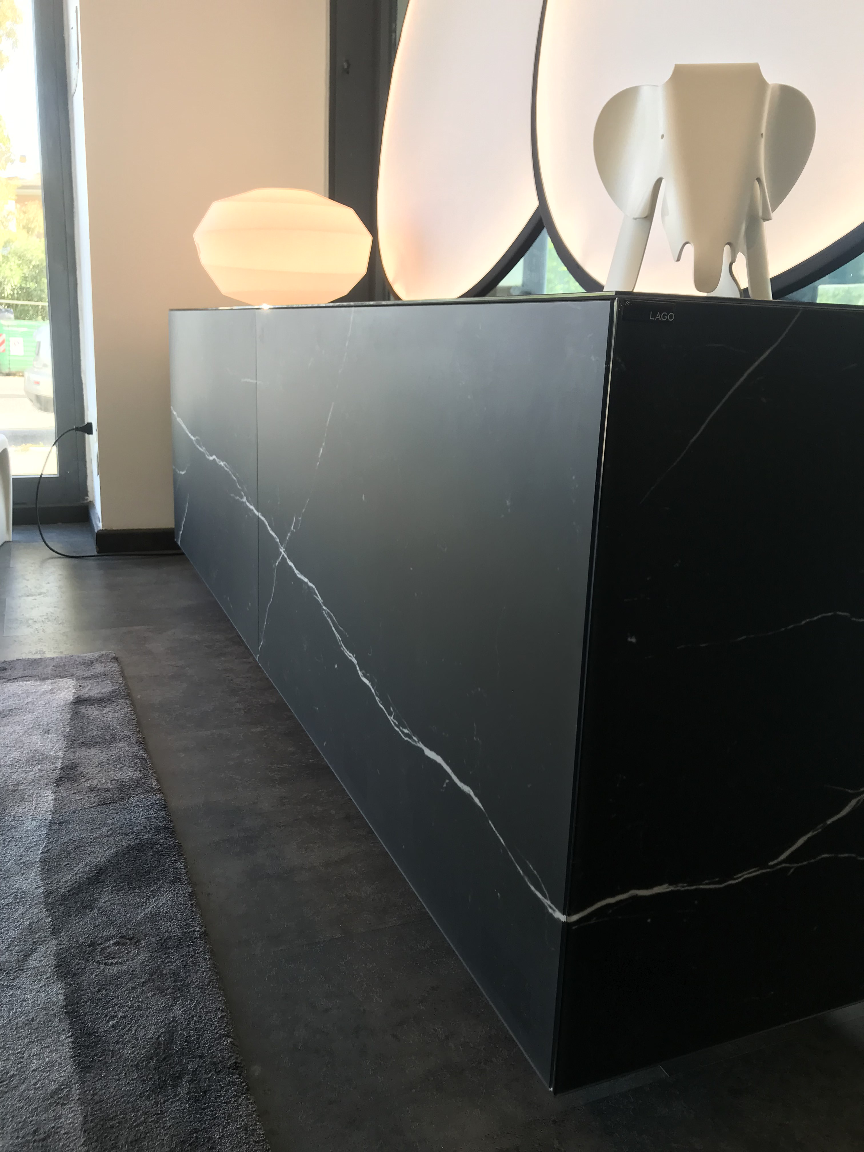 Madia Plenium Lago bifacciale (da posizionare anche centrostanza) in vetro Xglass finitura Nero Marquinia opaco. Ante complanari.