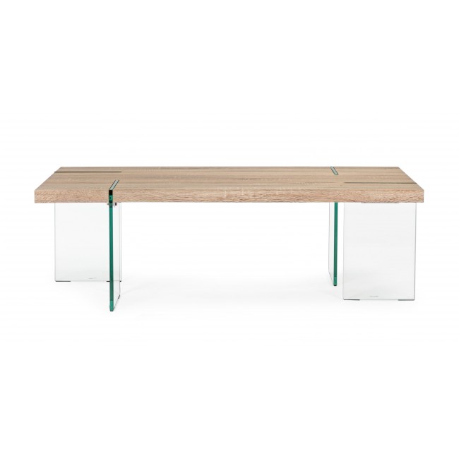 GAMBE IN VETRO TEMPERATO TRASPARENTE SP 12MM. PIANO IN MDF RIVESTITO CON CARTA MELAMINICA EFFETTO LEGNO.