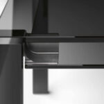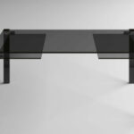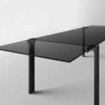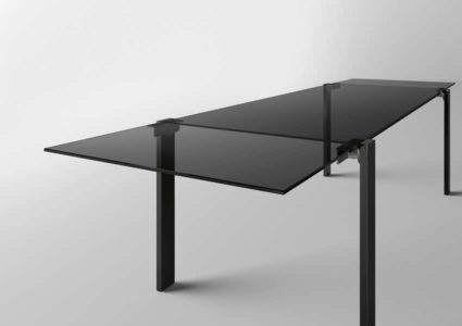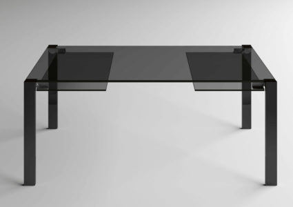 Tavolo allungabile. Struttura in vetro temperato, con piani d’appoggio allungabili. Disponibile in vetro trasparente o extrachiaro. Gambe cromate, laccate bianche o nere, rivestite in pelle o legno, o nelle finiture rame spazzolato, oro spazzolato, bronzo spazzolato o canna di fucile.